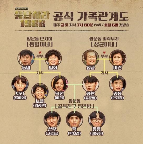 <응답하라 1988>은 서울 도봉구 쌍문동 골목을 배경으로, 다섯 가족의 일상과 그 자녀들의 성장 이야기, 우정, 첫사랑, 가족애를 그린 작품입니다.